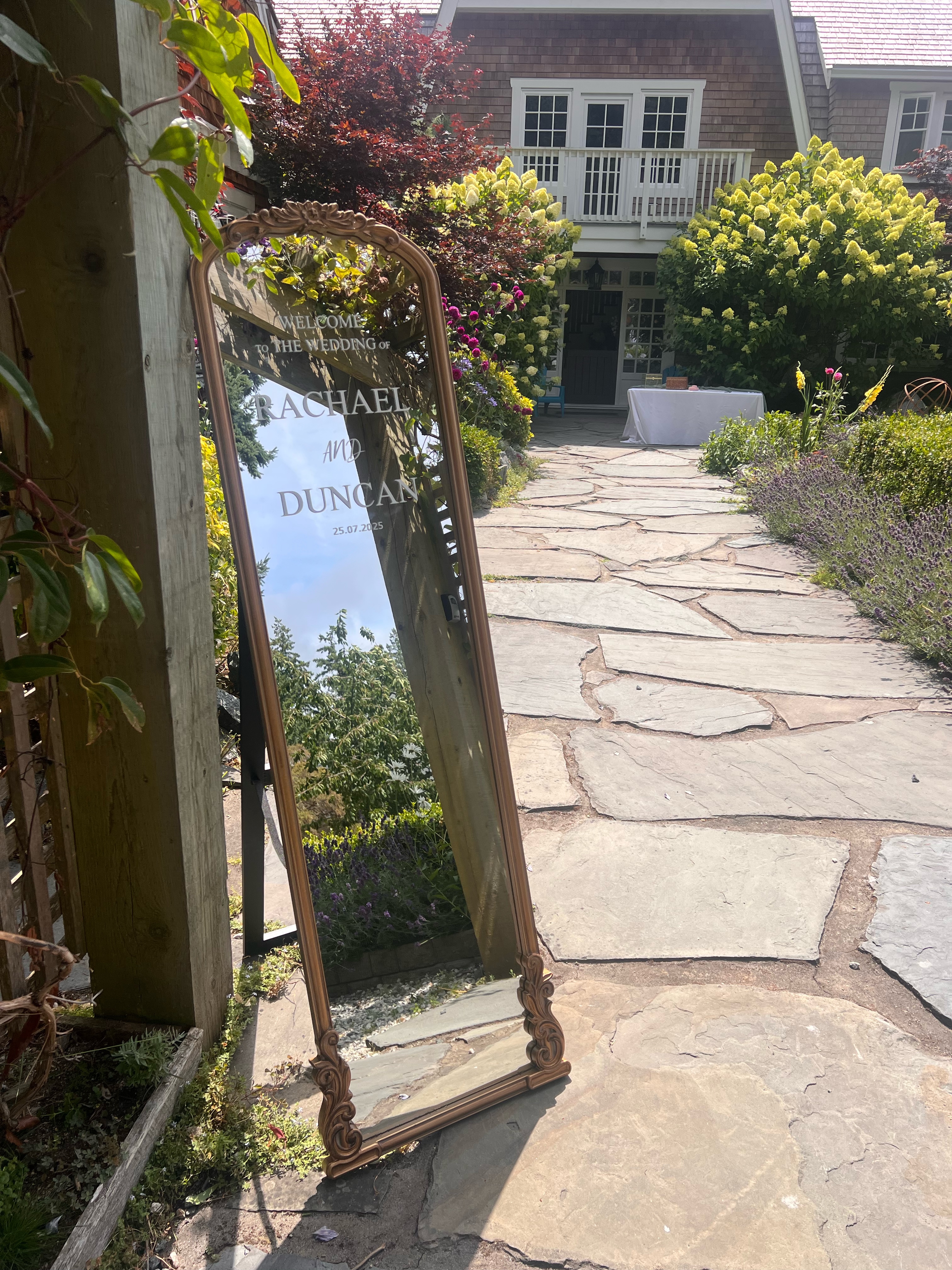 Add timeless elegance to your wedding entrance with our stunning full-length vintage look mirror, framed in ornate gold detailing. This statement piece makes the perfect base for a welcome message, seating chart, or custom decal for your ceremony or reception. Whether placed at the start of your aisle or near your venue entrance, it reflects both beauty and charm.